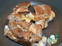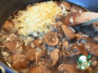 В это время начать готовить грибной соус. Грибы заранее разморозить. Возможно применение и других грибов. В сковороде обжаривать грибы в собственном соку, 5-7 минут на среднем огне. |