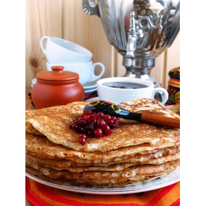 Подавать блины горячими с брусникой и свежим чаем. |