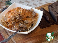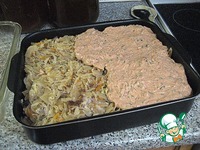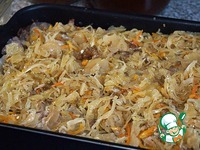 Когда ножки будут готовы, слегка остудить их, затем снять мясо с костей. В глубокую форму или противень уложить слоем половину капусты, затем мясо. |