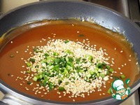 Как только по краям появятся пузырьки, а соус загустеет, убираем с плиты. Даём ему остыть, добавляем зелёный лук и кунжут. Хорошо перемешиваем, всё соус готов. |