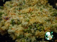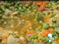 Слить лишнюю жидкость с горошка, добавить к овощам. Залить водой |