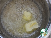 Снять с огня готовую карамель, добавить кусочками сливочное масло ТМ МИлье и перемешать до его растворения. |