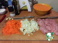 Красную колотую чечевицу замачивать не надо, просто промыть холодной водой. Лук и морковь мелко порезать, индейку нарезать на среднего размера куски. |