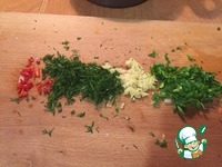 Зелень и перец мелко нарезать, чеснок пропустить через чеснокодавилку. |