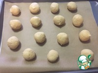 По истечении 3х часов, достать тесто и разделить на небольшие кусочки. Скатать шарики размером примерно с грецкий орех и положить на противень, застеленный пергаментной бумагой. |