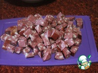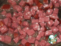 В сковороду наливаем масло. Добавляем колбасу. Обжариваем 3 минуты, периодически помешивая. |