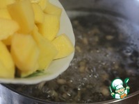 В кастрюлю наливаем 2 литра чистой воды. Солим. Как только закипит, добавляем отваренную фасоль и картофель. Варим до готовности картофеля. |