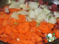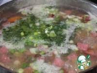 Выкладываем в овощной суп обжаренные овощи с колбасой. |
