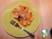 Сверху выкладываем порезанную картошку, лавровый лист и немного воды, закрываем крышкой, ставим в духовку |