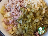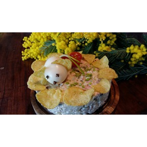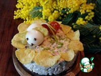 Добавление в салат трех видов мяса придаст ему неповторимый насыщенный вкус. Я украсила салат мышкой и чипсами. |