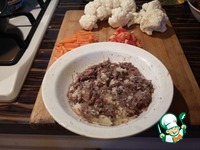 Пока фасоль варится, нарезаем мелко лук, морковь брусочками, цветную капусту разбираем на соцветия. Тушенку перекладываем в тарелку и мелко разминаем мясо вилкой или руками. |