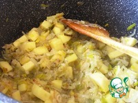 Разогреть, но не раскаливать, масло в толстодонной кастрюле. Выложить лук и помешивая, пассеровать под крышкой, не давая сильно румянится, до легкой позолоты. |