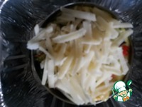 Отправляем в духовку еще на 10 минут, достаем, освобождаем от кольца, сверху еще посыпаем немного сыра и подаем. |