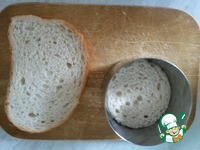 Из ломтиков булочки вырезаем кружочки, так чтобы они были по размеру кольца, это будет подушкой для омлета |