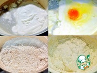Дрожжи вылила в миску, насыпала соль, разрыхлитель, ванилин и положила сметану. Просеяла 300 г муки, разбила яйцо и перемешала. Миску с тестом поставила в тепло. |