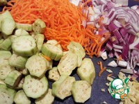 Нарезать мелким кубиком лук, морковь я натерла на "корейской" терке, баклажаны порезать некрупно. Чеснок измельчить. Брюссельскую капусту я разрезала на половинки. |