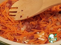 В подходящей кастрюле разогреть оливковое масло, выложить лук и обжарить до желаемой степени зажарки. Добавить морковь. Обжарить. Добавить чеснок. |