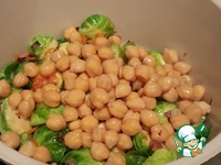 Добавить баклажаны, брюссельскую капусту и нут. Помешивая обжаривать на среднем огне, следить, чтобы не пригорало, при необходимости можно влить немного кипятка. |
