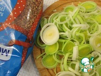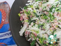В сковороду, в которой обжаривались грибы, налить оливковое масло. Обжарить бекон, зеленую часть лука-порея и репчатый лук. |