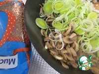На сковороде разогреть оливковое масло. Обжарить шампиньоны и добавить лук-порей. Обжаривать несколько минут до мягкости лука. Затем посолить и поперчить. Снять с огня. |