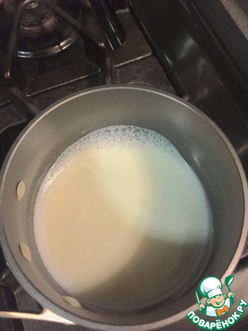 Вторую половину молока налить в сотейник, добавить сахар и ванильный сахар. Довести до кипения на медленном огне. |