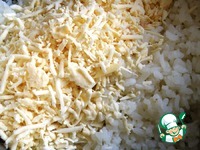 В холодный рис натереть хорошо плавящийся сыр, отложив немного для верха пирожков. |