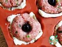 Разложить тесто по формочкам, прижав в середине и расправив края. Выложить по ложке риса, приминая. Сверху уложить скатанные мокрыми руками тефтельки. В середину вдавить по маслинке. |