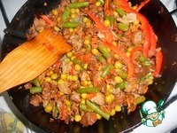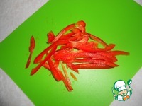 Посолить, поперчить по вкусу, добавить нарезанный сладкий перец. Перемешать и обжаривать в течении 4-5 минут. |