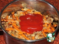И обжаренные овощи. Добавляем острый томатный соус. |