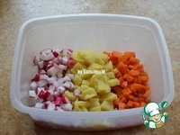 Для того, чтобы салат был наиболее вкусным, всех нарезанных ингредиентов должно быть примерно одинаковое количество визуально; Картофель, морковь, редис порезать не мелкими кубиками; Размешать; |