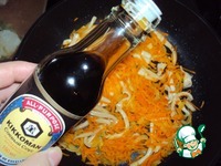 Затем к кальмарам добавить овощи, соевый соус, специи, спассеровать все вместе еще минуту. |