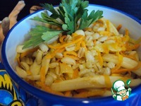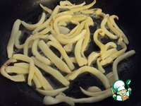 Тушку кальмара ошпарить кипятком, очистить, нарезать соломкой и обжарить в масле в течение 3 мин. (я жарила на другой сковороде, отдельно от овощей). |