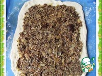 Выкладываю половину начинки и распределяю её лопаткой по всему листу, оставляя с трех сторон свободное тесто 1-2 см. |