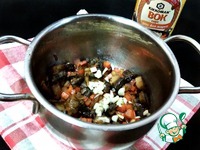 Грибы нарезать небольшими кусочками, чеснок измельчить любым удобным для вас способом (я мелко нарезала). Грибы и чеснок добавить к овощам и обжарить 5 минут. |