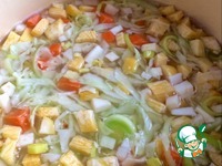 Перловку замочить на ночь предварительно. Нарезать кубиками морковь, репу, сельдерей. Нашинковать капусту, измельчить лук-порей, репчатый лук. Чеснок и имбирь я натёрла на мелкой тёрке. |