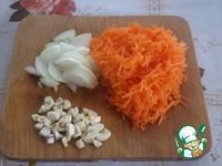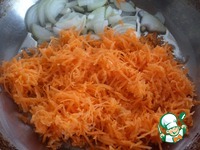 В сковороду наливаем растительное масло. Выкладываем лук и морковь. Обжариваем 1-2 минуты. |