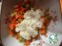 Рис отварить до готовности, в салатник выложить нарезанные овощи, добавить рис. |