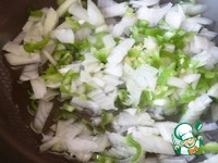 Очистить и мелко нарубить лук и свежий перец. Имбирь нарубить совсем мелко. В горячем масле слегка притомить овощи. |
