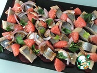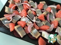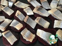 Выложите на тарелку свеклу, сверху выложите кусочки селедки. |