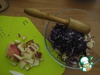 Оба вида капусты шинкуем тонко, присыпаем солью и мялкой бьём её, чтобы она дала сок. Яблоко режем соломкой. Отправляем в салатник. |