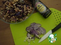 Чеснок мелко рубим, лук режем тонкими полу-кольцами. Всё отправляем в салатник. |