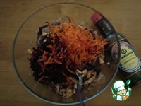 Свёклу и морковь натираем на тёрке и - тоже в салатник. |