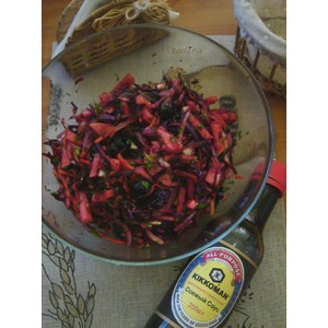 Описание: Овощной салат из двух видов капусты, свёклы, моркови, яблока, заправленный пикантной заправкой с соевым соусом. Легко, вкусно, полезно, витаминно!