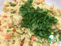 Добавьте все овощи и зелёный горошек, перемешайте. |