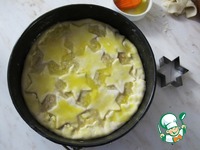 Затем выложить начинку. Из остатков теста, с помощью формочек для печенья сделать украшения для верха. Верх смазать желтком. |