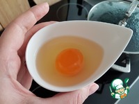 Опускаем мисочку с яйцом, чуть наклонив, на 1/3 в кипяток и аккуратно, медленно выливаем яйцо в воду. |