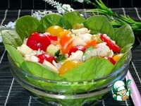 Салат выложила горкой на листья шпината и посыпала зелёным луком. |
