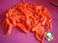 Морковь нарезать полосками и добавить к мясу и луку. Для утятницы - добавить морковь, убавить немного огонь и тушить еще 5-7 минут. |