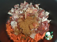 Мясо отделить от костей и нарезать кубиками. Покидать в чашу мультиварки. Для утятницы - обжарить мясо в масле 5-7 минут, помешивая, чтобы обжарилось равномерно |