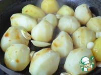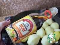 Влить по всему картофелю соевый соус. Очень хорошо применить соус ВОК для жарки от ТМ Киккоман. Добавить чеснок |